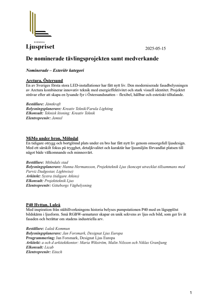 Svenska Ljuspriset: Tävlingsprojekt och medverkande 2025