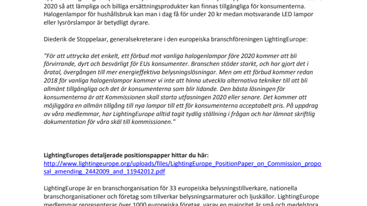 LightingEurope är mycket oroad över vilka effekter detta förbud skulle få för konsumenterna. Därför uppmanar LightingEurope den Europeiska kommissionen att skjuta upp förbudet fram till åtminstone 2020 så att lämpliga och billiga ersättningsprodukter kan finnas tillgängliga för konsumenterna. Halogenlampor för hushållsbruk kan man i dag få för under 20 kr medan motsvarande LED lampor eller lysrörslampor är betydligt dyrare.