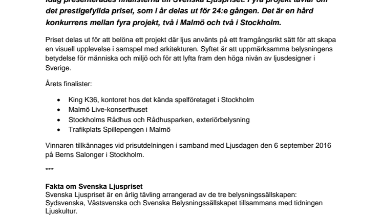 Idag presenterades finalisterna till Svenska Ljuspriset. Fyra projekt tävlar om det prestigefyllda priset, som i år delas ut för 24:e gången. Det är en hård konkurrens mellan fyra projekt, två i Malmö och två i Stockholm.