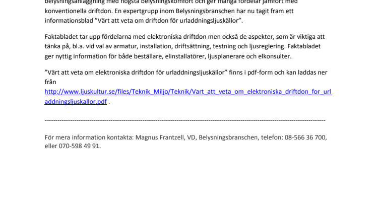 För mera information kontakta: Magnus Frantzell, VD, Belysningsbranschen, telefon: 08-566 36 700, eller 070-598 49 91.