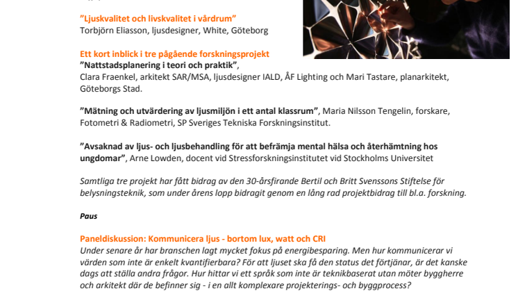 Ett annat aktuellt ämne är, bl.a.läkande ljus inom vården, som Torbjörn Eliasson, ljusdesigner från White i Göteborg, tar upp i sitt föredrag: ”Ljuskvalitet och livskvalitet i vårdrum”.