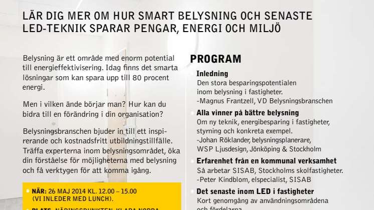 Den 26 maj anordnar Belysningsbranschens ett utbildningsseminarium för kommuner, landsting, länsstyrelser, energirådgivare, m.m. för att visa på möjligheter med den senaste belysningstekniken och ge konkreta exempel och tips på hur man kan gå tillväga. Representanter från press och media är också välkomna att delta.