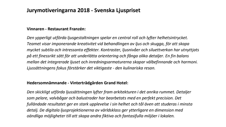 ”Den ypperligt utförda ljusgestaltningen spelar en central roll och lyfter helhetsintrycket. Teamet visar imponerande kreativitet vid behandlingen av ljus och skugga, för att skapa mycket subtila och intressanta effekter. Kontraster, ljusnivåer och siluettverkan har utnyttjats på ett finessrikt sätt för att underlätta orientering och fånga olika detaljer. En fin balans mellan det integrerade ljuset och inredningsarmaturerna skapar välbefinnande och harmoni. Ljussättningens fokus förstärker det viktigaste - den kulinariska resan.”