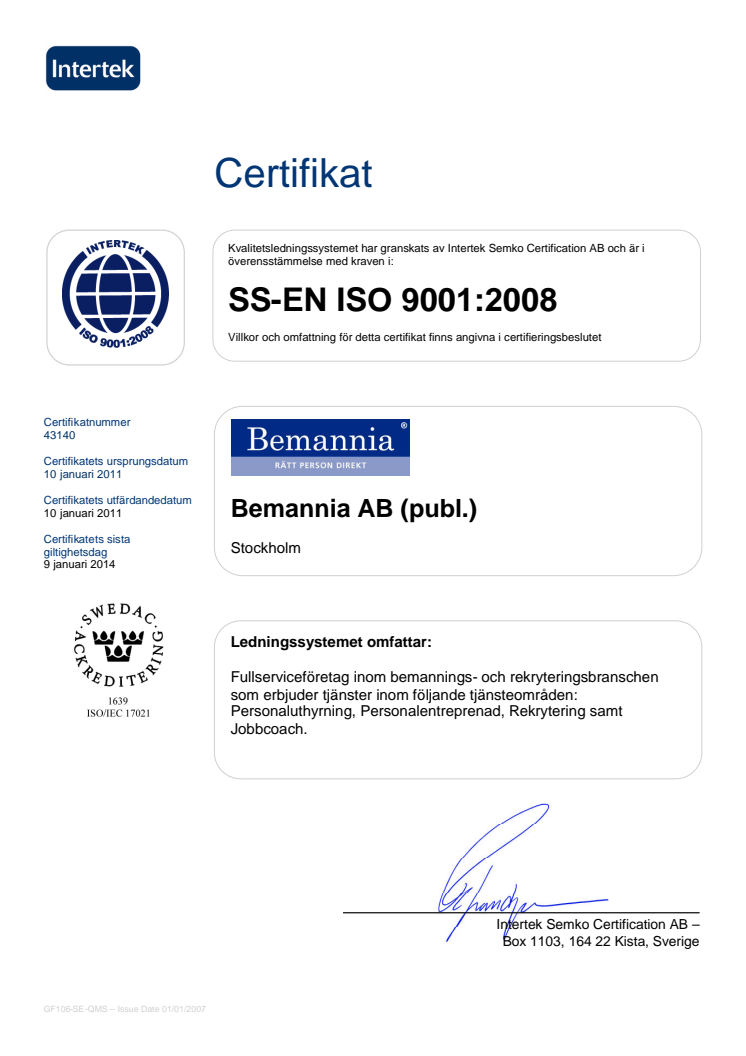 Kvalitetsledningssystemet har granskats av Intertek Semko Certification AB och är i överensstämmelse med kraven i: SS-EN ISO 9001:2008 för