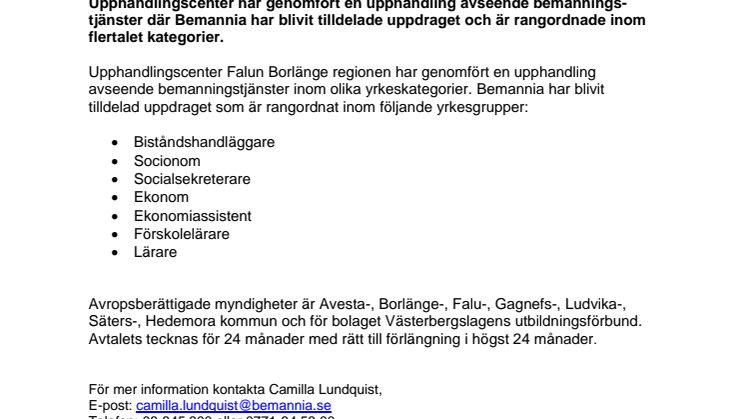 Upphandlingscenter Falun Borlänge regionen har genomfört en upphandling avseende bemanningstjänster inom olika yrkeskategorier. Bemannia har blivit tilldelad uppdraget som är rangordnat inom följande yrkesgrupper: