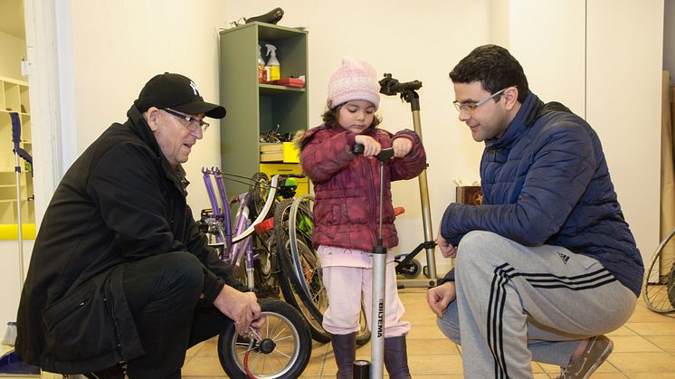 I ett av rummen – verkstaden – hjälper Avni Balaj, som har praktikplats på Fixoteket, Ibrahim Elgali att laga hjulet till en barnvagn. Här finns de verktyg och tillbehör som behövs.
