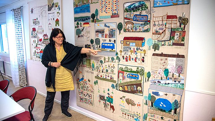 Runt om i lokalen hänger vackra textila konstverk. Det är broderier och konstverk från en grupp som träffas varje onsdag förmiddag. Gruppen har träffats i många år under ledning av Kvinnocenters Zdenka Kalisky och producerat flera utställningar och konstverk på varierande tema.