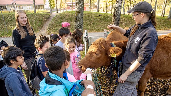 – Det här är jätteroligt och spännande att få mata djuren, säger åttaåringarna Jennifer och Eid, som båda går i årskurs 2 i Bergsjöskolan.