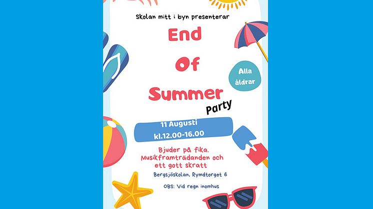 En regnig sommar avslutas bäst med fest och sol. Och det verkar det bli på fredag när Skolan mitt i byn – Bergsjön ordnar End of summer-party. Ta chansen att lyssna på brasilianska rytmer, pyssla, måla ansiktet, fika, spela fotboll och annat skoj.