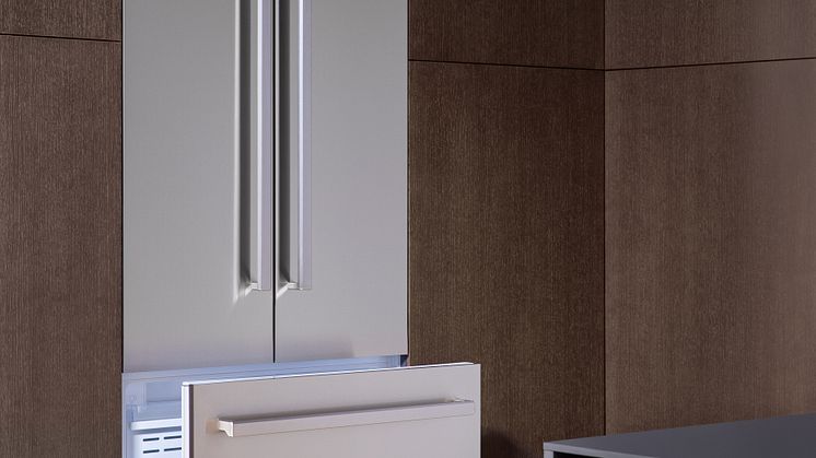 Bertazzoni lanserar nu en 90 cm bred french door kyl och frys för inbyggnad, som kan förses med valfria frontpaneler för sömlös integration i köksmiljön – paneler i rostfritt finns som tillbehör.
