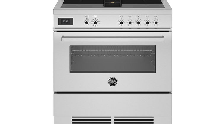 Den nya spisen från Bertazzoni, som lanseras i Norden i slutet av tredje kvartalet i år, integrerar tre apparater i en – den höga prestandan hos 90 cm fristående spisarna i serien Professional med induktionshäll kombineras med en integrerad premiumfläkt.