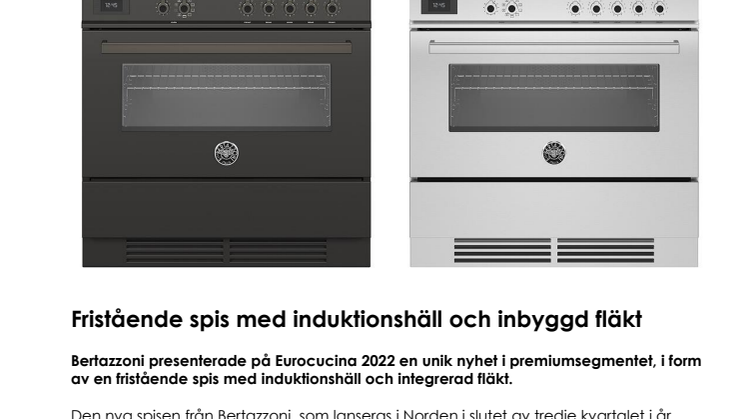 Bertazzoni presenterade på Eurocucina 2022 en unik nyhet i premiumsegmentet, i form av en fristående spis med induktionshäll och integrerad fläkt.
