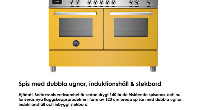 Hjärtat i Bertazzonis verksamhet är sedan drygt 140 år de fristående spisarna, och nu lanseras nya flaggskeppsprodukter i form av 120 cm breda spisar med dubbla ugnar, induktionshäll och inbyggt stekbord.