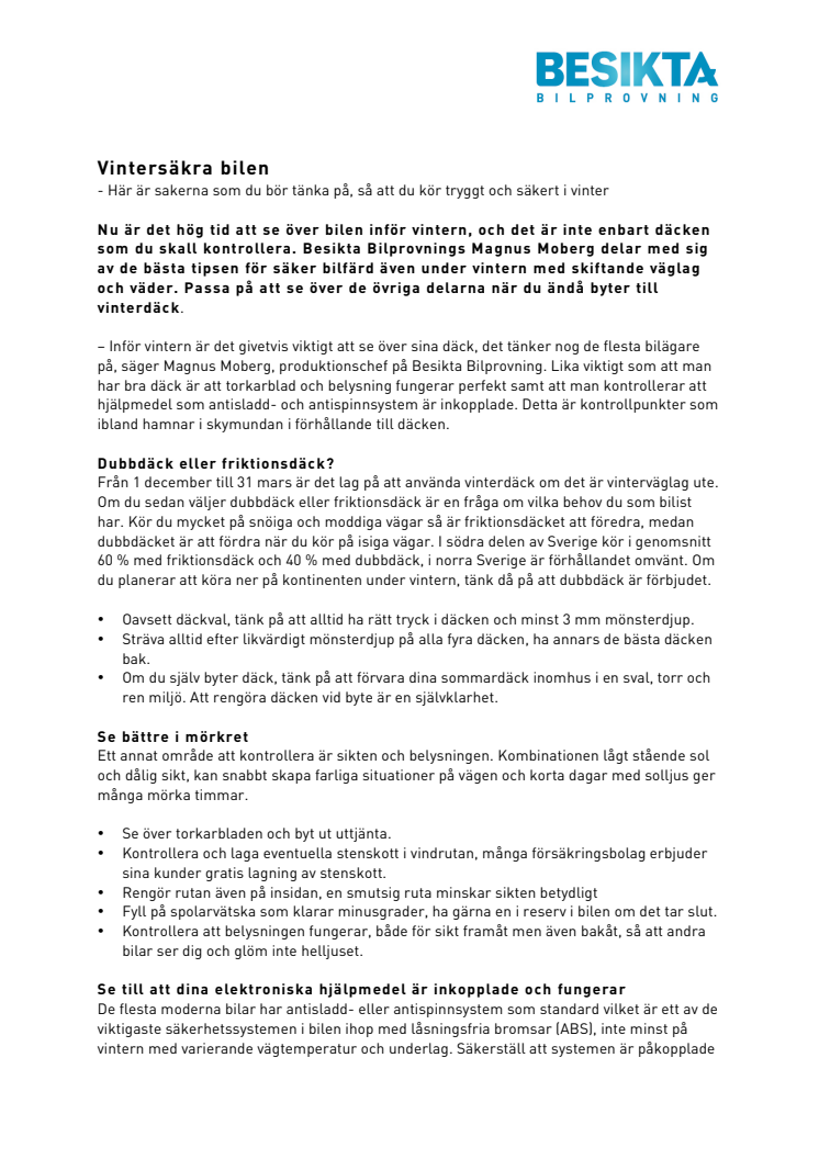 Nu är det hög tid att se över bilen inför vintern, och det är inte enbart däcken som du skall kontrollera. Besikta Bilprovnings Magnus Moberg delar med sig av de bästa tipsen för säker bilfärd även under vintern med skiftande väglag och väder. Passa på att se över de övriga delarna när du ändå byter till vinterdäck.