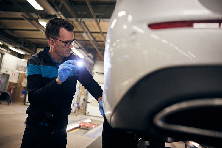 Besikta Besiktningstekniker kontrollerar hjul på personbil