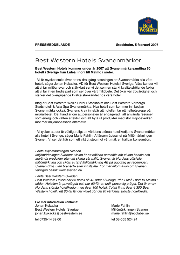 Best Western Hotels kommer under år 2007 att Svanenmärka samtliga 65 hotell i Sverige från Luleå i norr till Malmö i söder.