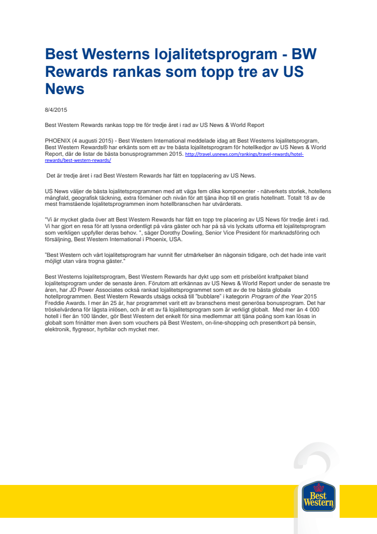 PHOENIX (4 augusti 2015) - Best Western International meddelade idag att Best Westerns lojalitetsprogram, Best Western Rewards® har erkänts som ett av tre bästa lojalitetsprogram för hotellkedjor av US News & World Report, där de listar de bästa bonusprogrammen 2015. http://travel.usnews.com/rankings/travel-rewards/hotel-rewards/best-western-rewards/