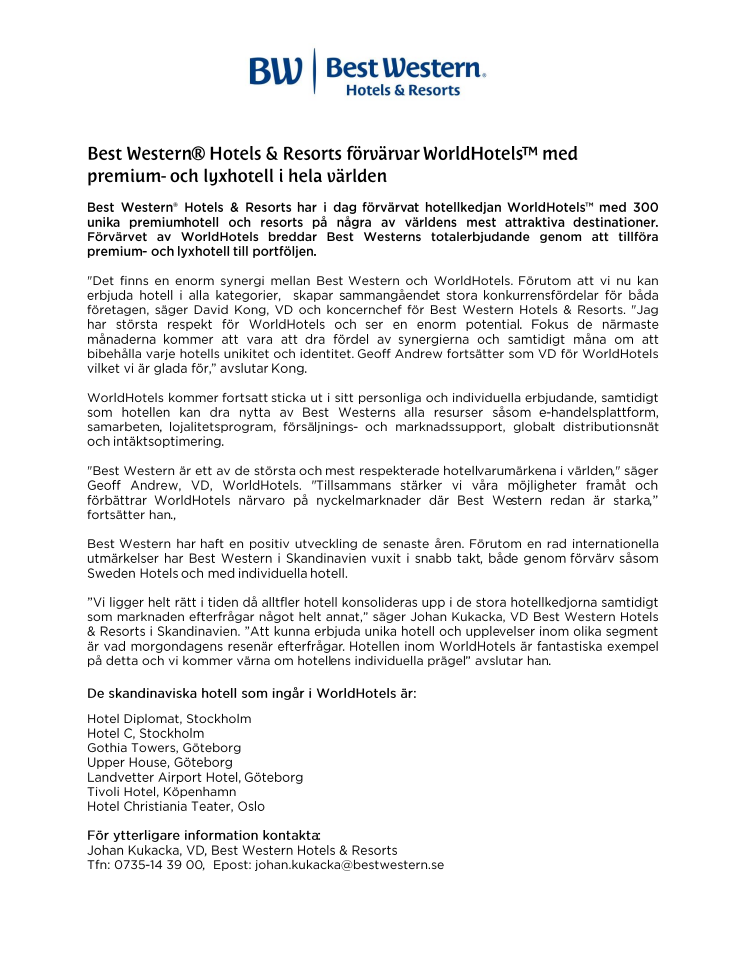 "Best Western är ett av de största och mest respekterade hotellvarumärkena i världen," säger Geoff Andrew, VD, WorldHotels. "Tillsammans stärker vi våra möjligheter framåt och förbättrar WorldHotels närvaro på nyckelmarknader där Best Western redan är starka,” fortsätter han.,