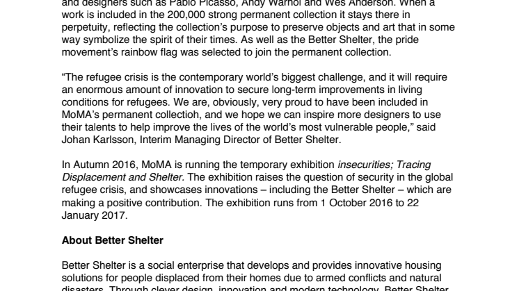 “The refugee crisis is the contemporary society's biggest challenge, and it will require an enormous amount of innovation to produce long-term improvements in living conditions for refugees. We are, obviously, very proud to have been included in MoMA’s permanent collection, and we hope we can inspire more designers to use their talents to help improve the lives of the world’s most vulnerable people,” said Johan Karlsson, Interim Managing Director of Better Shelter.