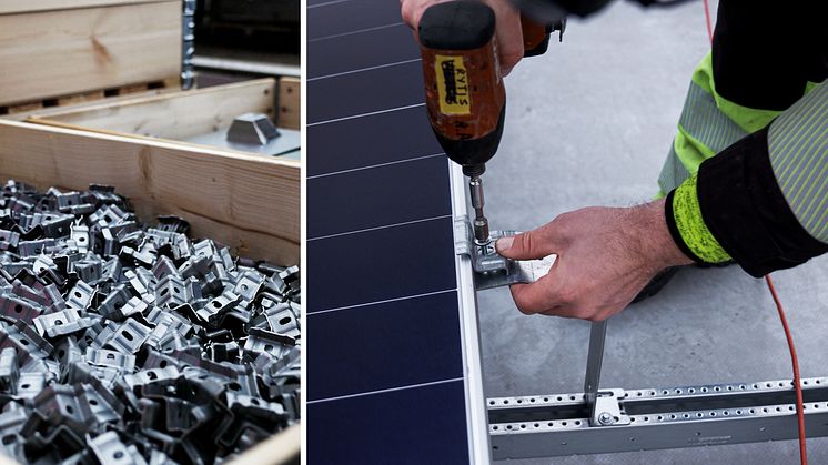 Här fästs solpanelen med en ändklämma ovanpå ett mittfäste.