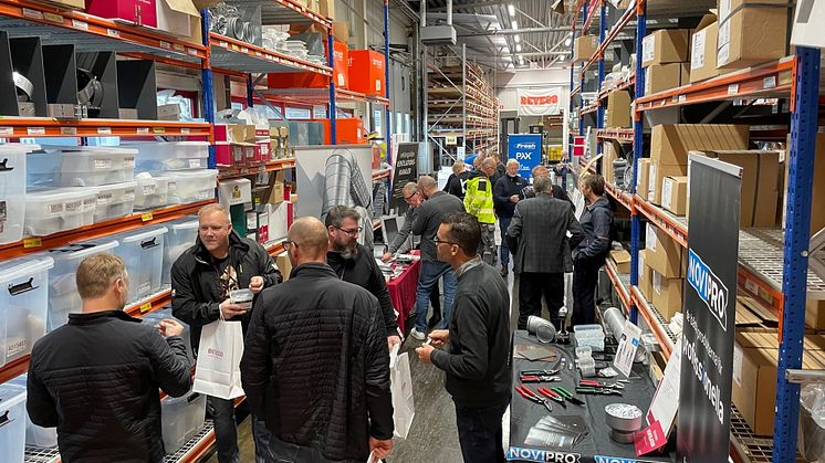 Bevegos filial i Borås öppnade i sina nybyggda lokaler här på Sandlidsgatan för 4 år sedan, så ett par minimässor har man hunnit med i dessa lokaler. Här arrangeras minimässan både i butiken och ute på lagret. För att gå tipspromenaden och besöka alla leverantörer startar man vid butikens entré och slutar vid porten där foodtrucken med fish and chips står och förbereder för lunchen. Vid första stoppet står Erik Grune, KAM inom ventilation på Bevego, och berättar om ventilationskanaler som Bevego tillverkar i egen regi.