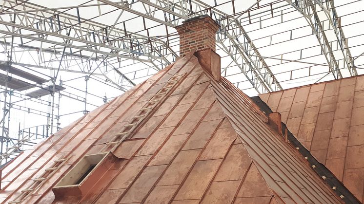 ”Vi har använt glödgad kopparplåt som vi beställt genom Bevego. I projektet har vi haft kontinuerlig kontakt med Bevego i Helsingborg och beställt koppar i omgångar, för man vågar inte ha massa koppar liggande på verkstaden eftersom det är så stöldbegärligt. Glödgad kopparplåt har en matt yta och den har hunnit mörkna ganska mycket sedan vi började med taket i september 2022. Plåten kommer inte att bli grön såsom äldre koppar blev, idag är materialet så rent att det inte ärgar på samma sätt. Den bruna nyansen blir väldigt bra till den röda tegelfasaden.” avslutar Bengt.