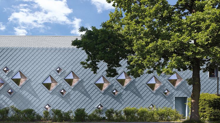 Projekt: Karl-Heinz Klein Sporthall. På tak och fasad används prePATINA blue-grey.