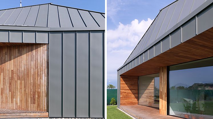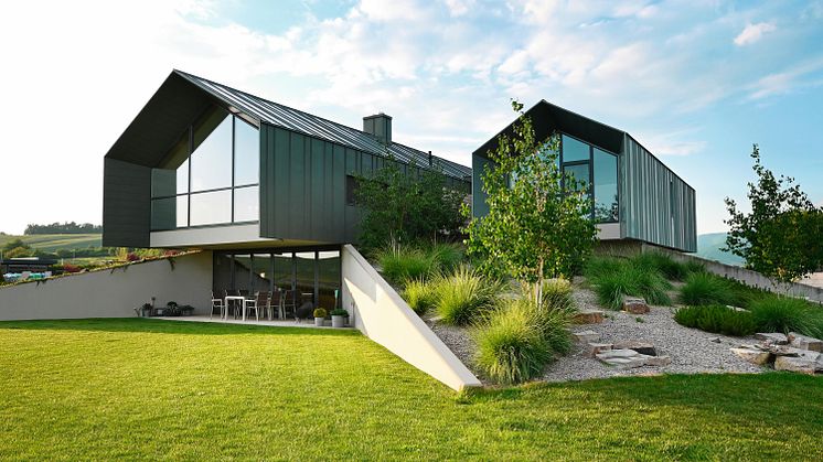 Projekt: Residential Building 100Doly Skačany. PrePATINA blue-grey och prePATINA graphite-grey har kombinerats på tak och fasad.