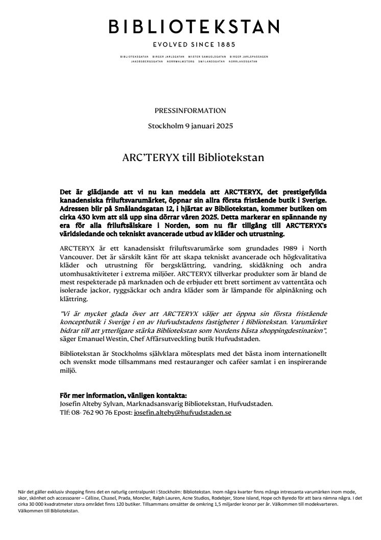”Vi är mycket glada över att ARC'TERYX väljer att öppna sin första fristående konceptbutik i Sverige i en av Hufvudstadens fastigheter i Bibliotekstan. Varumärket bidrar till att ytterligare stärka Bibliotekstan som Nordens bästa shoppingdestination”, säger Emanuel Westin, Chef Affärsutveckling butik Hufvudstaden.
