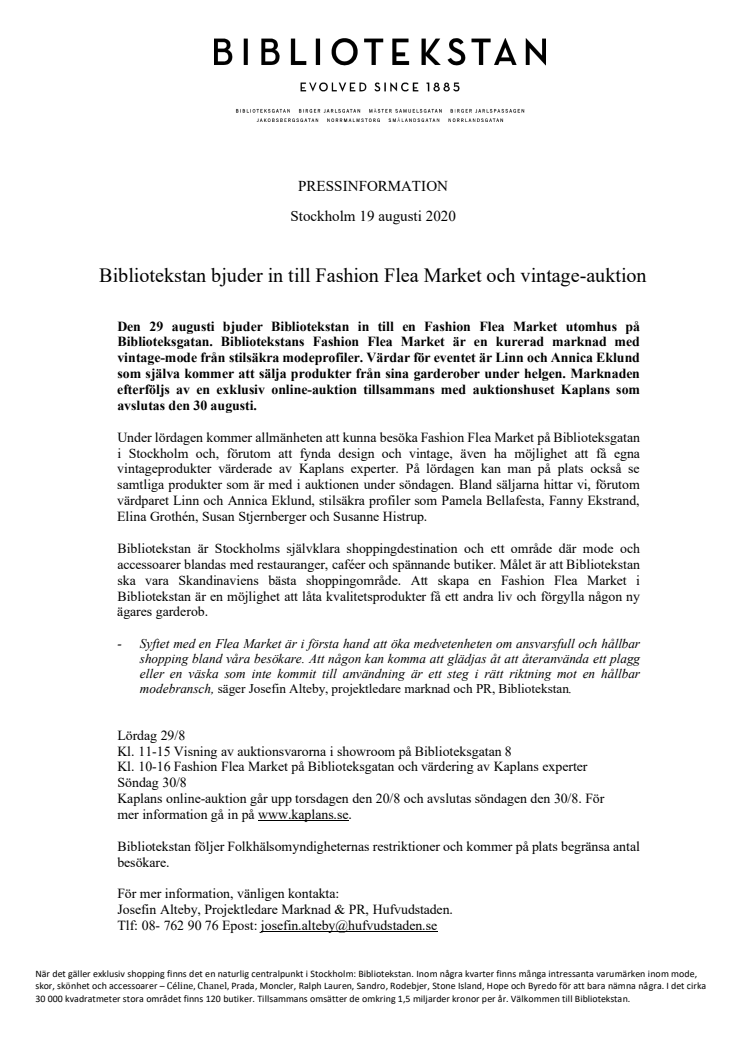 Den 29 augusti bjuder Bibliotekstan in till en Fashion Flea Market utomhus på Biblioteksgatan. Bibliotekstans Fashion Flea Market är en kurerad marknad med vintage-mode från stilsäkra modeprofiler. Värdar för eventet är Linn och Annica Eklund som själva kommer att sälja produkter från sina garderober under helgen. Marknaden efterföljs av en exklusiv online-auktion tillsammans med auktionshuset Kaplans som avslutas den 30 augusti.