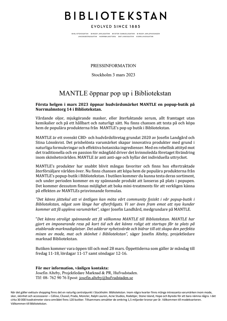 I början av mars 2023 öppnar hudvårdsmärket MANTLE en popup-butik på Norrmalmstorg 14 i Bibliotekstan.