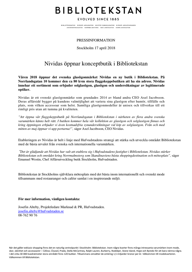 "Det är glädjande att Nividas har valt att etablera sig i Hufvudstadens fastighet i Bibliotekstan. Nividas stärker Bibliotekstan och området kring Norrmalmstorg som Skandinaviens bästa shoppingdestination och mötesplats", säger Emanuel Westin, Chef Affärsutveckling butik Stockholm, Hufvudstaden.