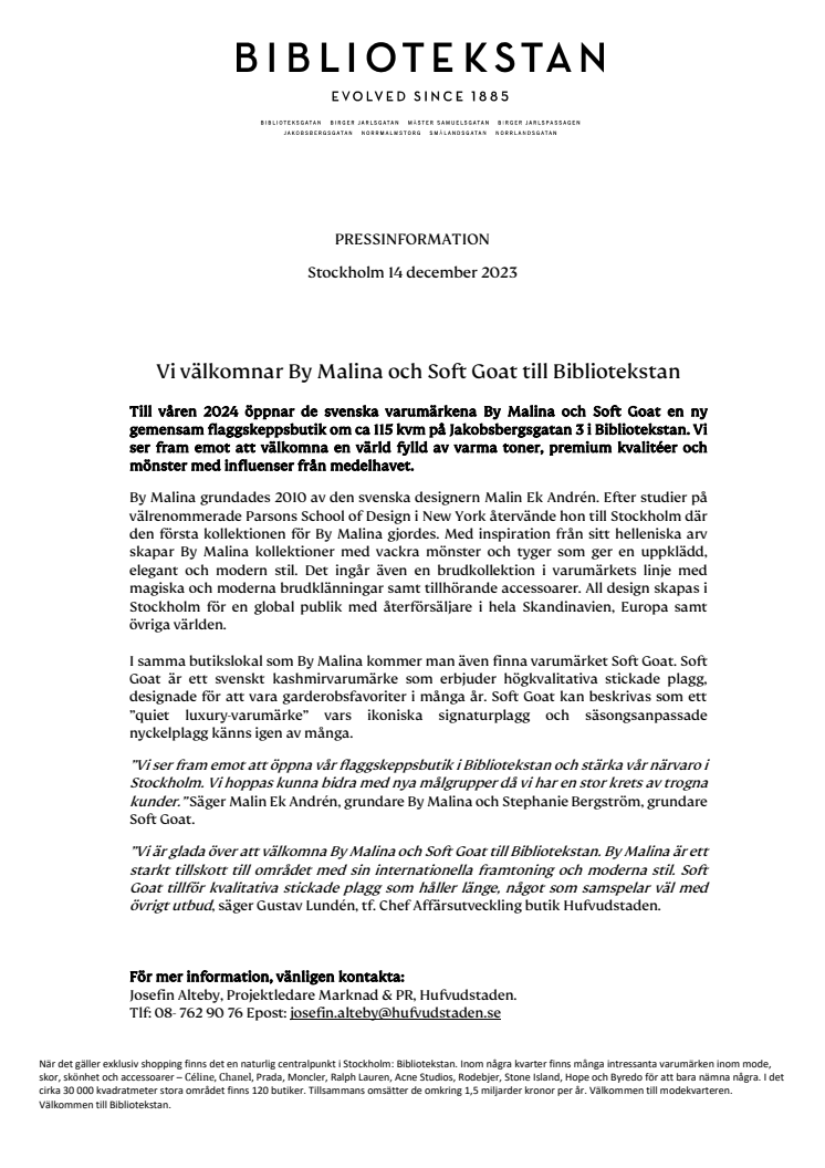 ”Vi är glada över att välkomna By Malina och Soft Goat till Bibliotekstan. By Malina är ett starkt tillskott till området med sin internationella framtoning och moderna stil. Soft Goat tillför kvalitativa stickade plagg som håller länge, något som samspelar väl med övrigt utbud, säger Gustav Lundén, tf. Chef Affärsutveckling butik Hufvudstaden.