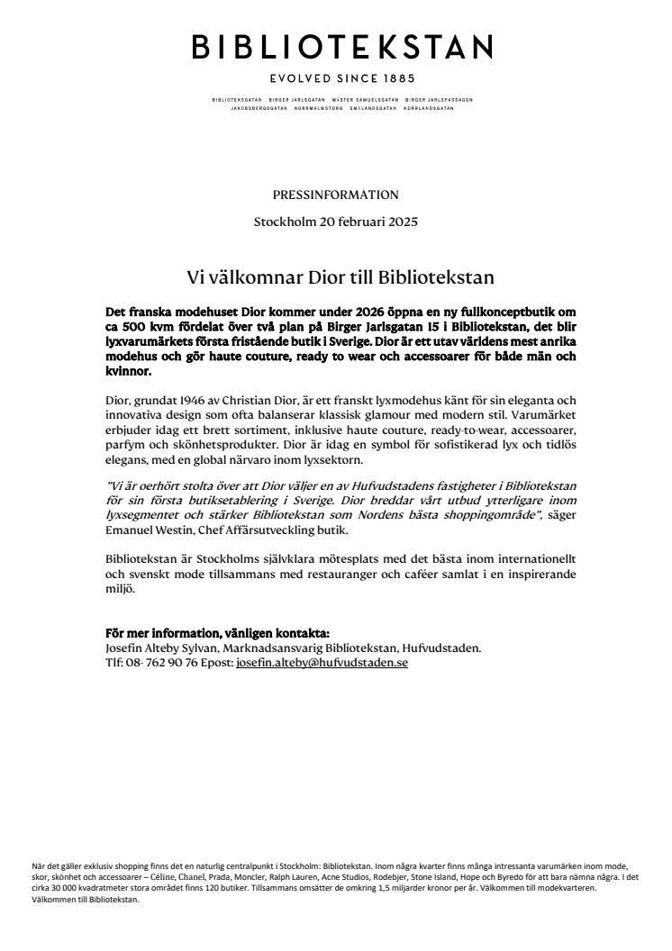 ”Vi är oerhört stolta över att Dior väljer en av Hufvudstadens fastigheter i Bibliotekstan för sin första butiksetablering i Sverige. Dior breddar vårt utbud ytterligare inom lyxsegmentet och stärker Bibliotekstan som Nordens bästa shoppingområde”, säger Emanuel Westin, Chef Affärsutveckling butik.