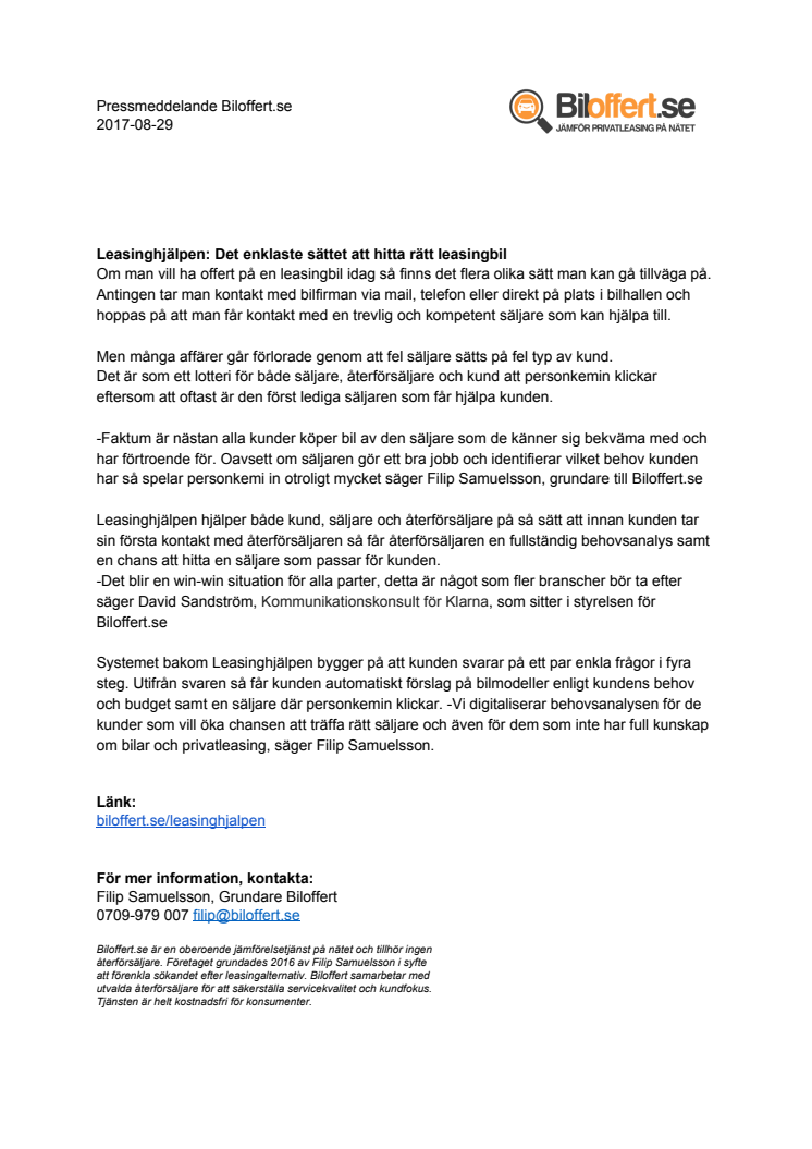 Leasinghjälpen hjälper både kund, säljare och återförsäljare på så sätt att innan kunden tar sin första kontakt med återförsäljaren så får återförsäljaren en fullständig behovsanalys samt en chans att hitta en säljare som passar för kunden. -Det blir en win-win situation för alla parter, säger David Sandström, Kommunikationskonsult för Klarna, som sitter i styrelsen för Biloffert.se