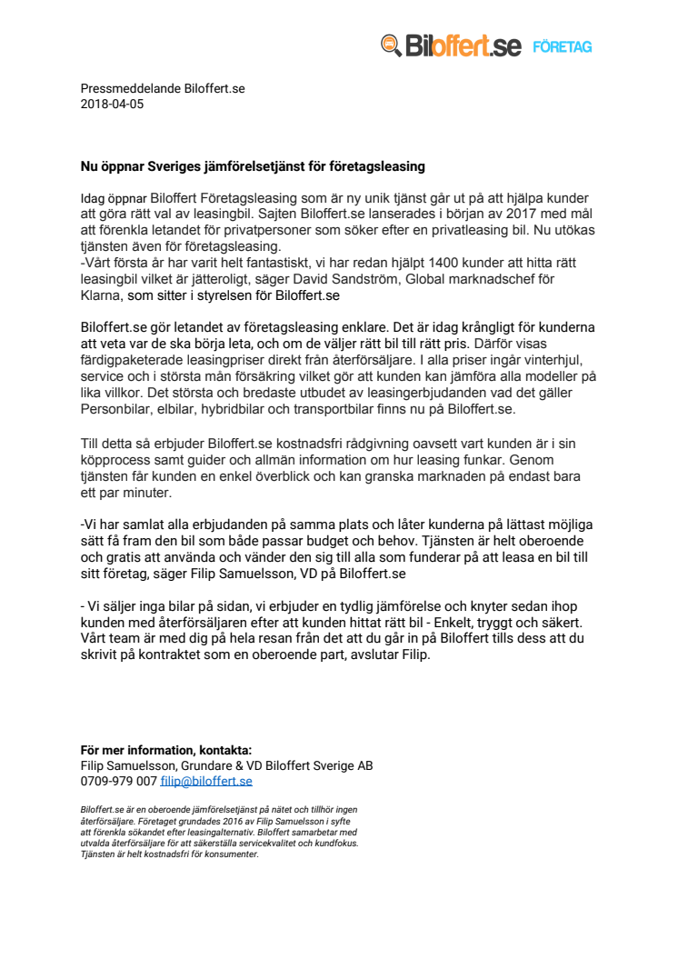Idag öppnar Biloffert Företagsleasing som är ny unik tjänst går ut på att hjälpa kunder att göra rätt val av leasingbil. Sajten Biloffert.se lanserades i början av 2017.