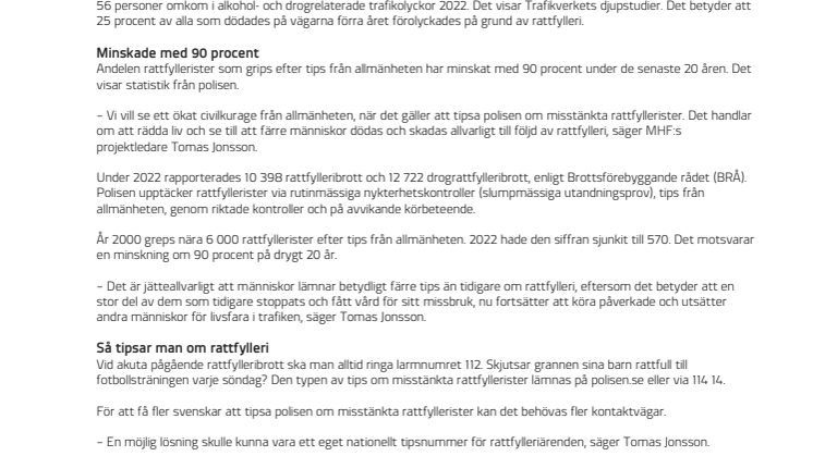 – Vi vill se ett ökat civilkurage från allmänheten, när det gäller att tipsa polisen om misstänkta rattfyllerister. Det handlar om att rädda liv och se till att färre människor dödas och skadas allvarligt till följd av rattfylleri, säger MHF:s projektledare Tomas Jonsson.