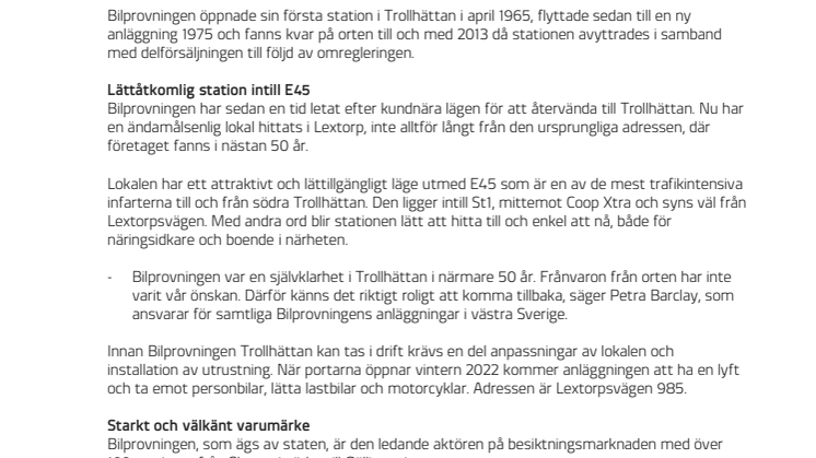 -Bilprovningen var en självklarhet i Trollhättan i närmare 50 år. Frånvaron från orten har inte varit vår önskan. Därför känns det riktigt roligt att komma tillbaka, säger Petra Barclay, som ansvarar för samtliga Bilprovningens anläggningar i västra Sverige.