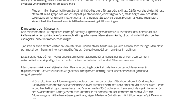 -Vi är stolta över att Bilprovningen har valt oss som en del av sitt hållbarhetsarbete. I vår dialog har Bilprovningen prioriterat hållbarhetsperspektivet samtidigt som den goda smaken fått ta stor plats. Beans in Cup har haft ett gott samarbete med Svanen sedan 2015 och ser nu fram emot de nya kriterierna för den Svanenmärkta kaffetjänsten som kommer efter sommaren. Det kommer att stärka vårt och Bilprovningens hållbarhetsarbete ytterligare, säger Marianne Strindin som är hållbarhetschef på Beans in Cup.