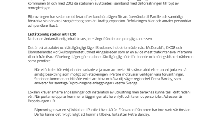 -När vi fick det här erbjudandet tackade vi ja utan att tveka. Vi strävar alltid efter att erbjuda en så smidig besiktning som möjligt och etableringen i Partille motsvarar verkligen våra förväntningar. Stationen kommer att bli både enkel att hitta och åka till, säger regionchef Petra Barclay, som ansvarar för samtliga Bilprovningens anläggningar i västra Sverige.