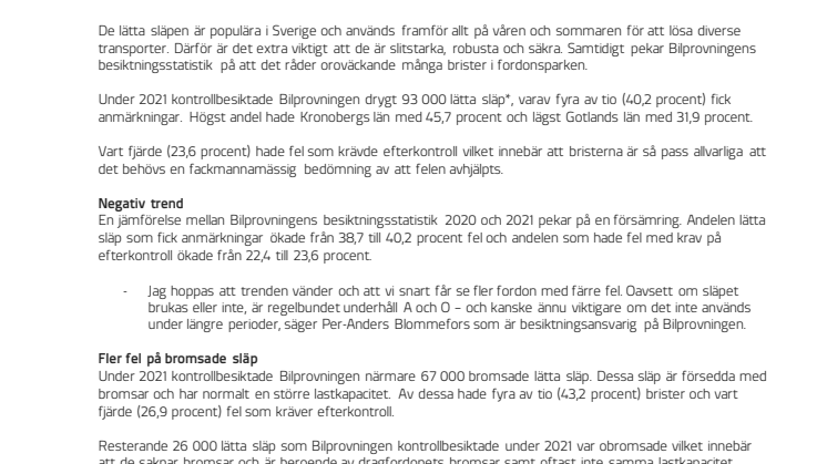 Under 2021 kontrollbesiktade Bilprovningen drygt 93 000 lätta släp*, varav fyra av tio (40,2 procent) fick anmärkningar. Högst andel hade Kronobergs län med 45,7 procent och lägst Gotlands län med 31,9 procent.