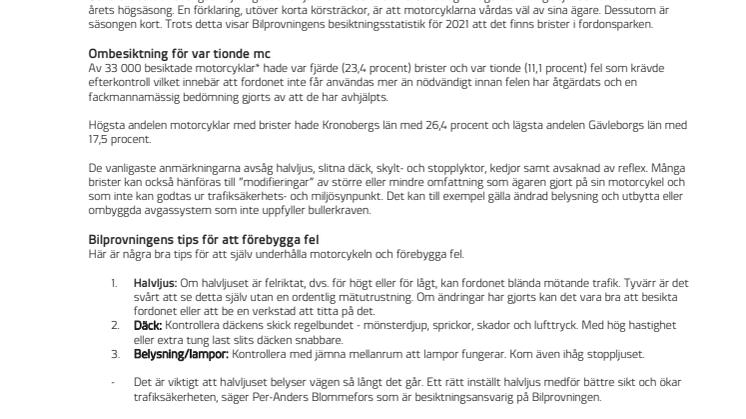 Våren är här och det är högsäsong för motorcyklar. Jämfört med andra fordonsslag är de i gott skick, men av de drygt 33 000 som Bilprovningen besiktade under 2021, hade var fjärde motorcykel brister och var tionde fel som kräver efterkontroll.