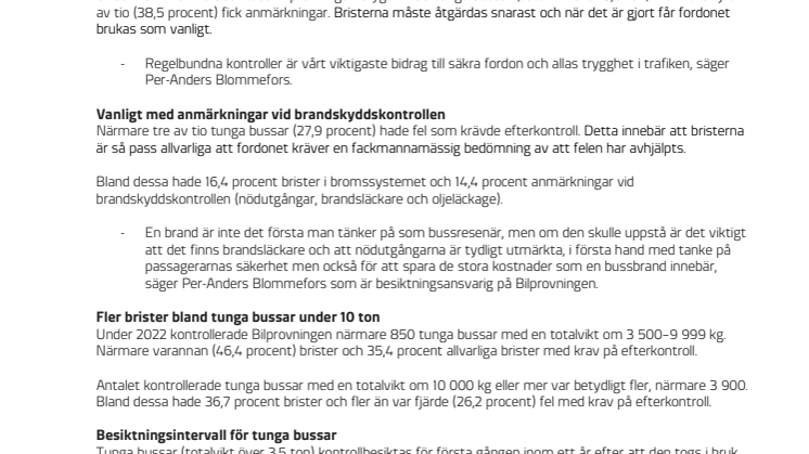 Under 2022 kontrollerade Bilprovningen närmare 850 tunga bussar med en totalvikt om 3 500–9 999 kg. Närmare varannan (46,4 procent) brister och 35,4 procent allvarliga brister med krav på efterkontroll.