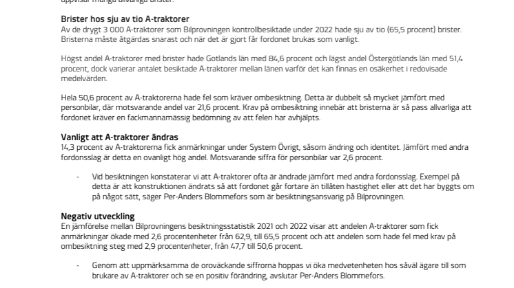 En jämförelse mellan Bilprovningens besiktningsstatistik 2021 och 2022 visar att andelen A-traktorer som fick anmärkningar ökade med 2,6 procentenheter från 62,9, till 65,5 procent och att andelen som hade fel med krav på ombesiktning steg med 2,9 procentenheter, från 47,7 till 50,6 procent.