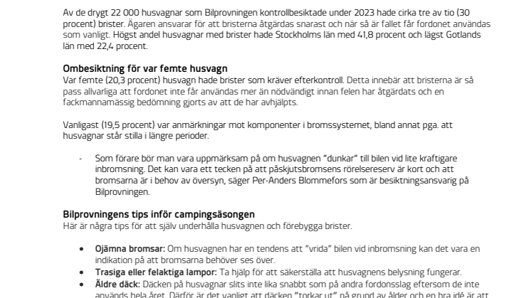 Av de drygt 22 000 husvagnar som Bilprovningen kontrollbesiktade under 2023 hade cirka tre av tio (30 procent) brister. Ägaren ansvarar för att bristerna åtgärdas snarast och när så är fallet får fordonet användas som vanligt. Högst andel husvagnar med brister hade Stockholms län med 41,8 procent och lägst Gotlands län med 22,4 procent.
