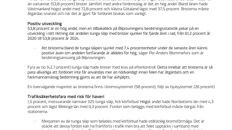 Av de närmare 22 000 tunga släp (totalvikt över 3,5 ton) som Bilprovningen besiktade under 2024 hade fler än vartannat (53,8 procent) brister. Jämfört med andra fordonsslag är det en hög andel. Bland länen hade Västmanland högst andel med 72,8 procent och Västra Götaland lägst med 37,5 procent. Bristerna måste åtgärdas snarast och när det är gjort får fordonet brukas som vanligt.