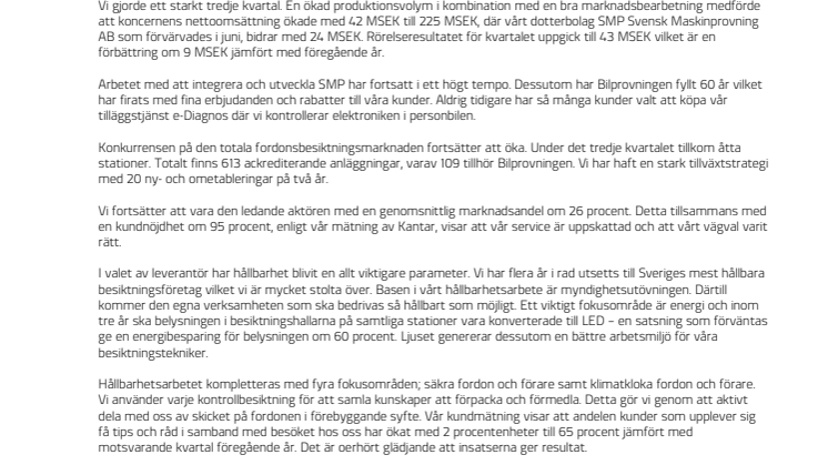 Vi gjorde ett starkt tredje kvartal. En ökad produktionsvolym i kombination med en bra marknadsbearbetning medförde att koncernens nettoomsättning ökade med 42 MSEK till 225 MSEK, där vårt dotterbolag SMP Svensk Maskinprovning AB som förvärvades i juni, bidrar med 24 MSEK. Rörelseresultatet för kvartalet uppgick till 43 MSEK vilket är en förbättring om 9 MSEK jämfört med föregående år.