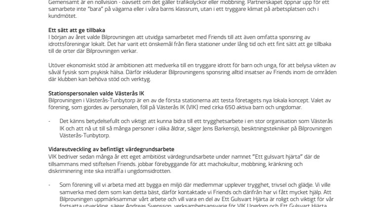 Bilprovningen och stiftelsen Friends har ett nationellt partnerskap. Sedan början av året har parterna även börjat samarbeta lokalt för att tillsammans medverka till en tryggare idrott för barn och unga. Bilprovningen i Västerås-Tunbytorp är en av de första stationerna att testa det lokala konceptet. Personalens val föll på Västerås IK och att stödja klubbens värdegrundsarbete ”Ett Gulsvart Hjärta”.