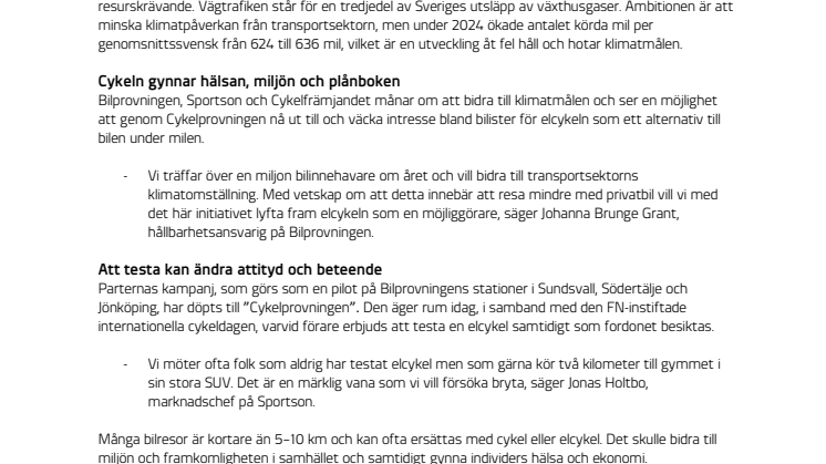 Idag, på FN:s internationella cykeldag, förvandlas för första gången Bilprovningen till Cykelprovningen. Detta sker i samarbete med Sportson och Cykelfrämjandet som en pilot på tre stationer. Syftet är att i samband med besiktningen ge bilister möjligheten att testa och upptäcka fördelarna med en elcykel för hälsan, miljön och den egna plånboken.