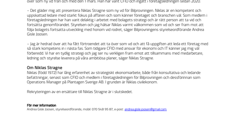 – Det gläder mig att presentera Niklas Stragne som ny vd för Bilprovningen. Niklas är en kompetent och uppskattad ledare med starkt fokus på affären och som känner företaget och branschen väl. Som medlem i företagsledningen har han varit delaktig i arbetet med bolagets strategi och är rätt person att ta vid och fortsätta genomförandet. Styrelsen och jag hälsar Niklas varmt välkommen som vd och ser fram mot att följa bolagets fortsatta utveckling med honom vid rodret, säger Bilprovningens styrelseordförande Andrea Gisle Joosen.